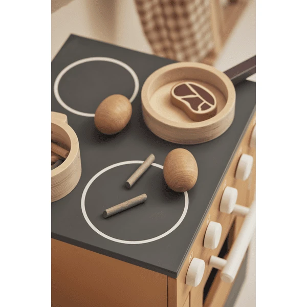 - Inclusief: 2 soorten pasta (15 spaghetti/6 rigatoni), 1 pak rijst, 2 aardappelen, 6 sperziebonen, 1 knoflook, 2 stukken vlees, 1 vis & 1 visfilet, 2 plakjes spek, zout- en peperstrooier met klikgeluid, 2 papieren zakken, houten kist