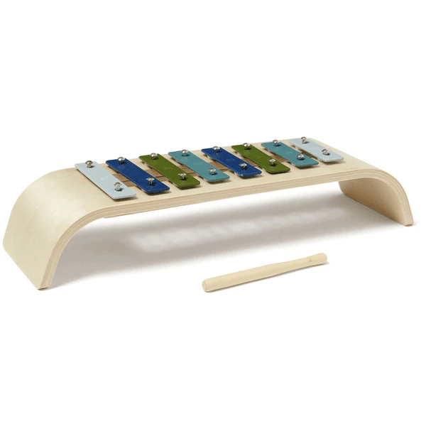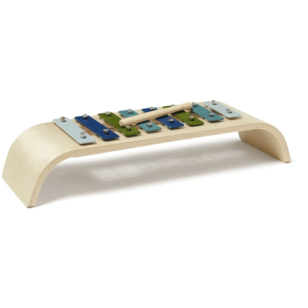 De xylofoon is gemaakt van natuurlijk gekleurd multiplex met blauwe toetsen.