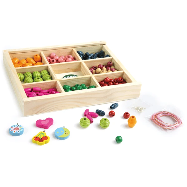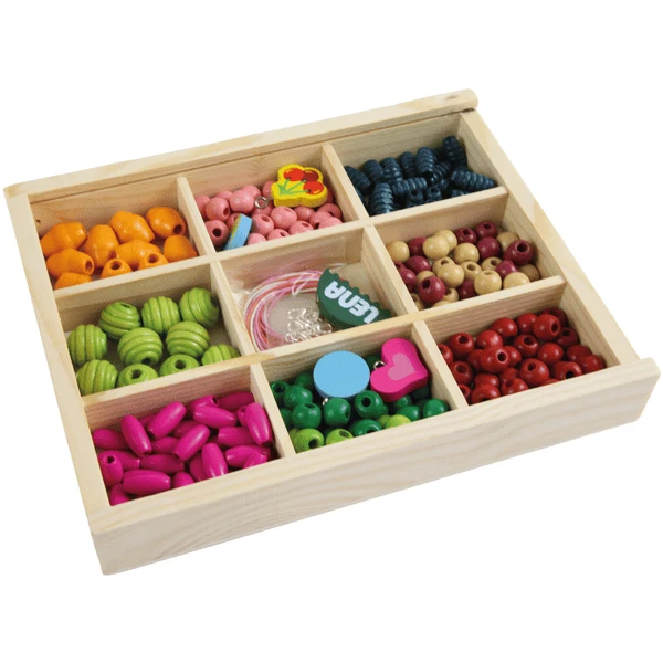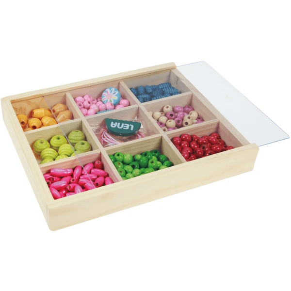 Veel verschillende, kleurrijke kralen om te rijgen. Hier kun je je iegen ketting of armband maken!
