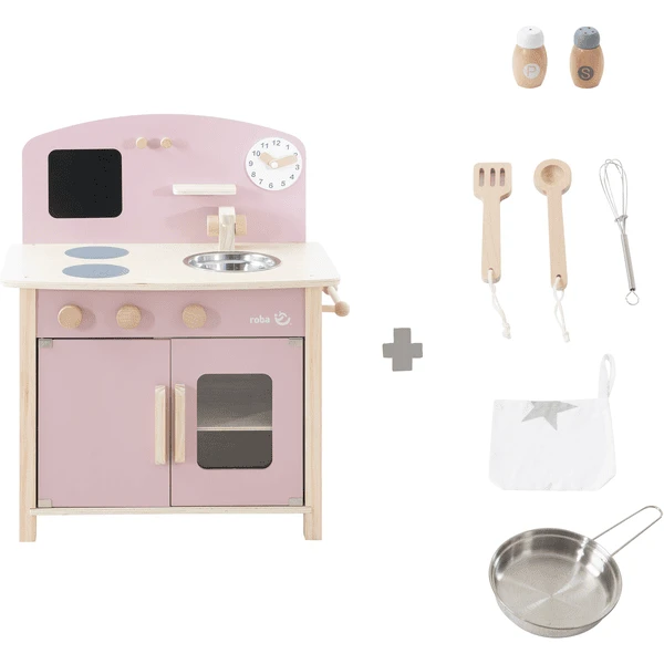 Het eenvoudige design met een klein bordoppervlak, accenten in mauve/roze en de waardevolle roba -etiketten maken van de kinderkeuken een blikvanger. De ruime speelgoedkeuken inclusief kast en diverse ophangmogelijkheden aan de keukenwand en zijkant biedt veel bergruimte. aden In het speelgoedkeukentje is plaats voor de boodschappen en het uitgebreide assortiment keukenaccessoires ( Metal pan, garde, kooklepel, spatel, theedoek, peper- en zoutstel). Dus niets staat een onmiddellijke start om te spelen in de weg!