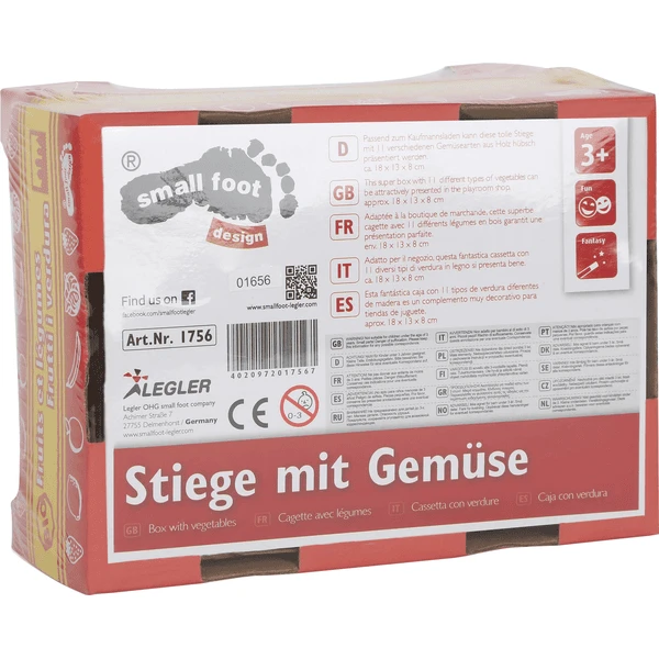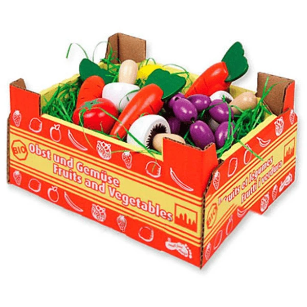 In deze stevige kartonnen doos zijn 11 verschillende stukken groente en fruit, gemaakt van gelakt hout, gepresenteerd op een bodem van kunstgras.