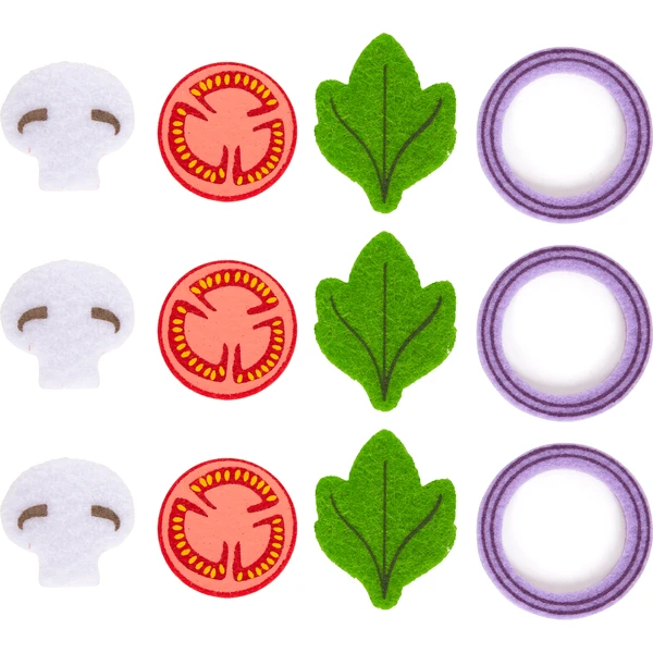 - Drie verschillende soorten pasta (farfalle, penne, tortellini) en champignons, tomaten, sla en uien van vilt zorgen voor realistisch speelplezier.