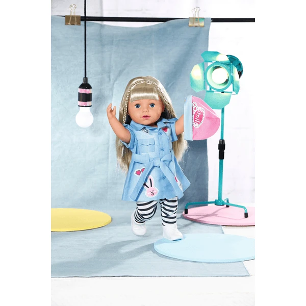 Het jeans-look exemplaar van BABY born heeft speelse turn-ups aan de mouwen, een symmetrische kraag, opgestikte zakken en een riempje met bindceintuur. Het is versierd met leuke prints die doen denken aan lapjes. Daaronder draagt de kleine Fashion ista een zwart-wit gestreepte legging en witte sneakers. En op het kleine hoofdje komt een roze kapje.